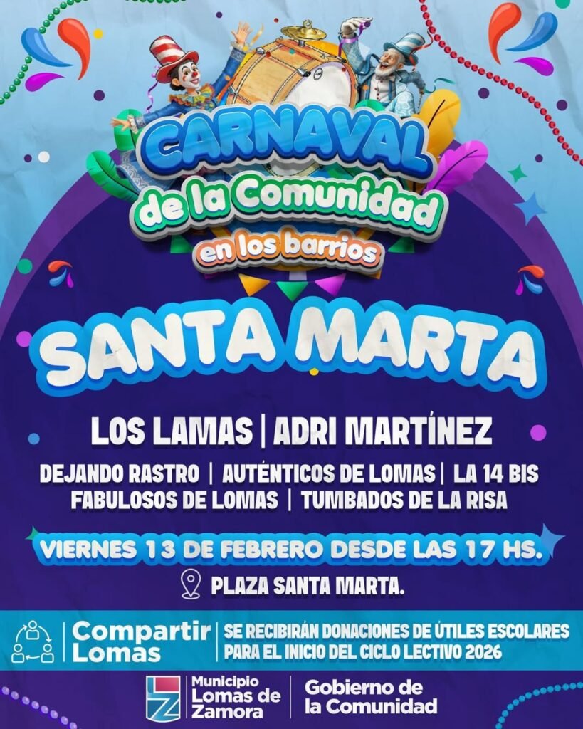 Uno de los barrios que más expectativa genera esta temporada es Santa Marta, que el viernes 13 se transformará en un verdadero carnaval barrial: desde las 17 hs la plaza local será testigo de la energía de murgas como Dejando Rastro, Auténticos de Lomas, La 14 Bis y Fabulosos de Lomas. Luego Adri Martínez y Los Lamas llevarán la música hasta el cierre de la noche.